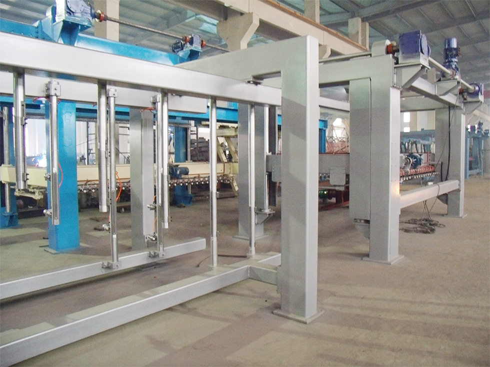 翻轉(zhuǎn)行車將坯體(帶模框、側(cè)板)在空中翻轉(zhuǎn)90°,吊運(yùn)放置切割臺(tái)或切割小車上,脫模進(jìn)行切割。另外,將脫模??蚺c返回的側(cè)板組模,吊運(yùn)至澆注回車線上進(jìn)行循環(huán)澆注。